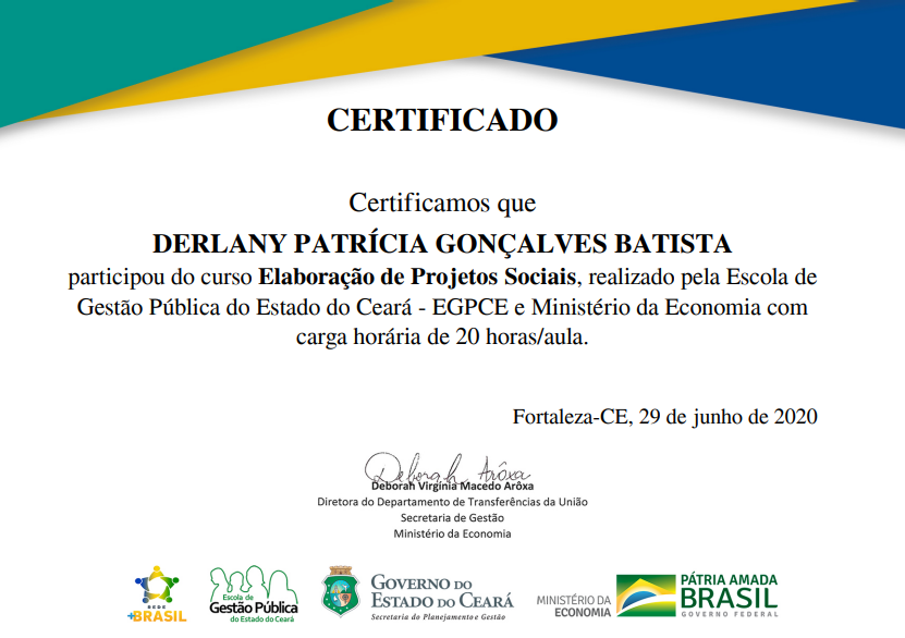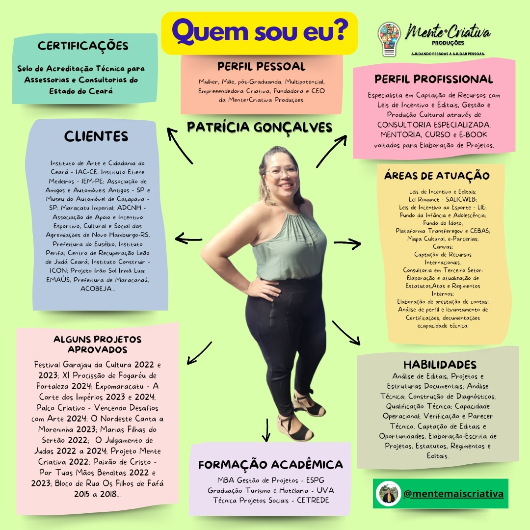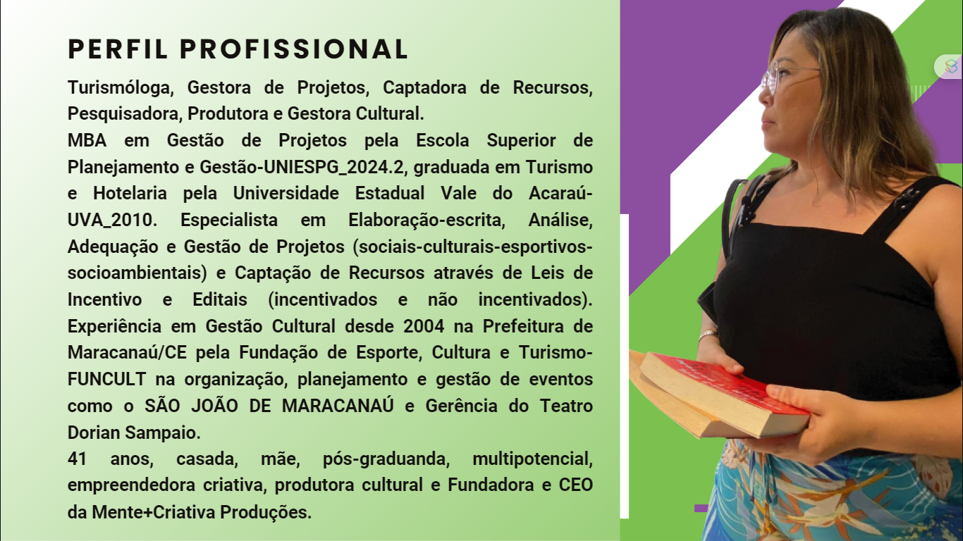 Turismóloga, Gestora de Projetos, Captadora de Recursos, Pesquisadora, Produtora e Gestora Cultural. Fundadora e CEO da Mente+Criativa Produções, Negócios e Projetos Sustentáveis LTDA. Pós-Graduanda em Política e Gestão Cultural pela Universidade Federal do Recôncavo da Bahia-UFRB_2028.1. MBA em Gestão de Projetos pela Escola Superior de Planejamento e Gestão-UNIESPG_2025.1. Graduada em Turismo e Hotelaria pela Universidade Estadual Vale do Acaraú-UVA_2010.> Especialista em Elaboração-escrita, Análise, Adequação, Adaptação, Gestão Estratégica e Prestação de Contas de Projetos de Impacto Sociais, Culturais, Esportivos, Socioambientais e Empreendedorismo Criativo.