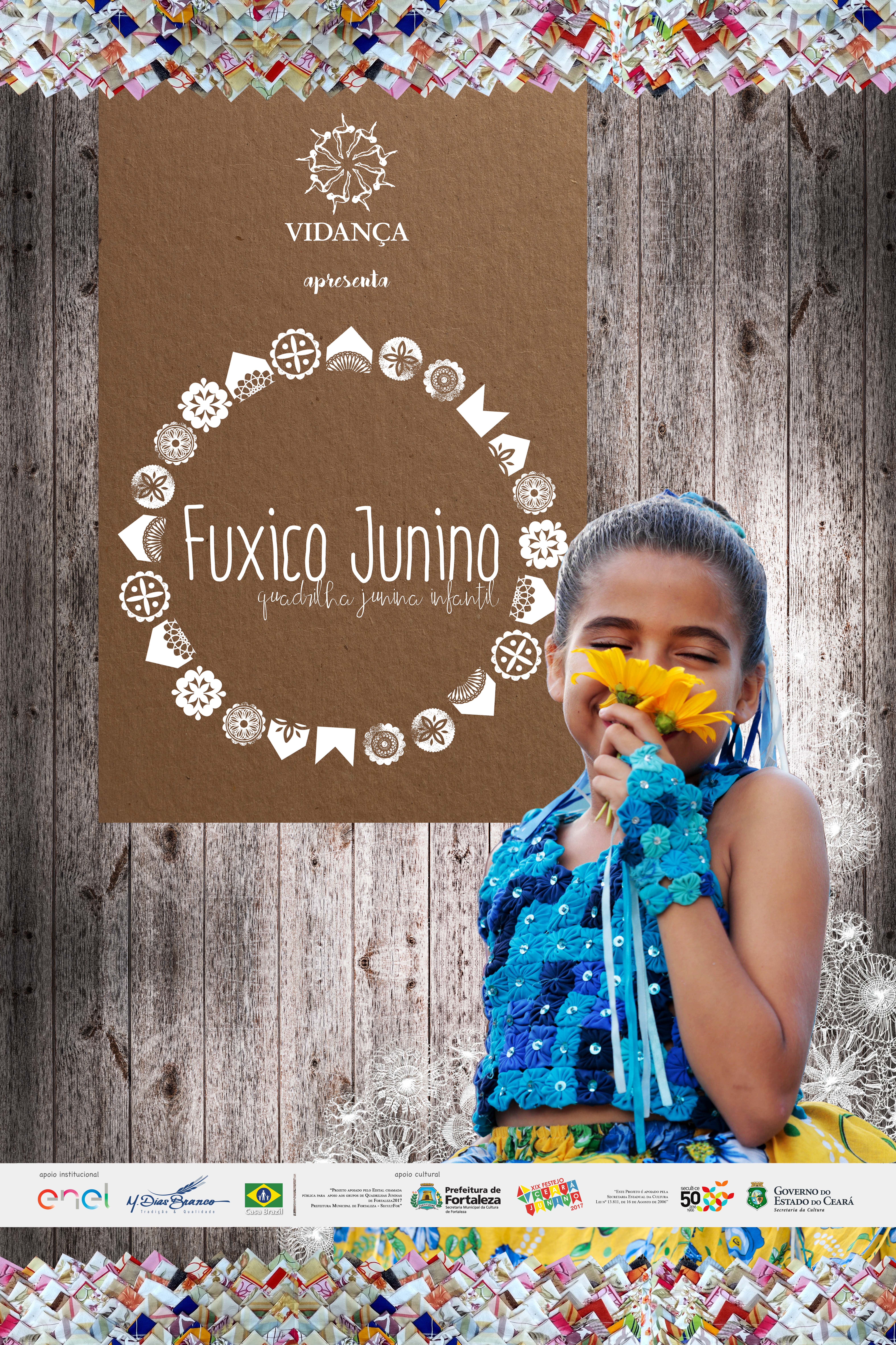 Com um trabalho aprimorado na força da cultura popular, o grupo de integrantes da Quadrilha Fuxico é composto por crianças, adolescentes e jovens atendidos na Escola de Artes e Ofícios Vidança que desenvolve há 37 anos um trabalho voluntário ministrando aulas de ballet clássico, danças dramáticas, laboratório de criação coreográfica, dança criativa, alongamento, consciência corporal, criações viso-manuais, criações literárias, capoeira, hip-hop, percussão, carpintaria e corte e costura. A formação do Grupo “Fuxico Junino” consiste em difundir as referências da cultura tradicional, trabalhada pela Escola Vidança na composição dos seus espetáculos, como é o caso do Espetáculo Catu Macã Guerra Bonita, que traz referências do Maracatu. Outros trabalhos, tais como “Histórias de Acordar o Amanhã” e “Esquadras”, também trazem danças populares em suas criações coreográficas como baião, coco, xaxado, bumba meu boi.Em 2015 a Quadrilha Fuxico Junino foi contemplada no XVII Edital Ceará Junino recebendo o apoio do Governo do Estado do Ceará e da Secretária de Cultura/SECULT o que possibilitou ao grupo realizar 17 apresentações em diversas entidades que desenvolvem atendimento ao publico infanto-juvenil, idosos, incluindo, as ruas e praças da comunidade dos bairros Vila Velha, Ellery e Carlito Pamplona no período de 05 de junho a 30 de julho/2015.