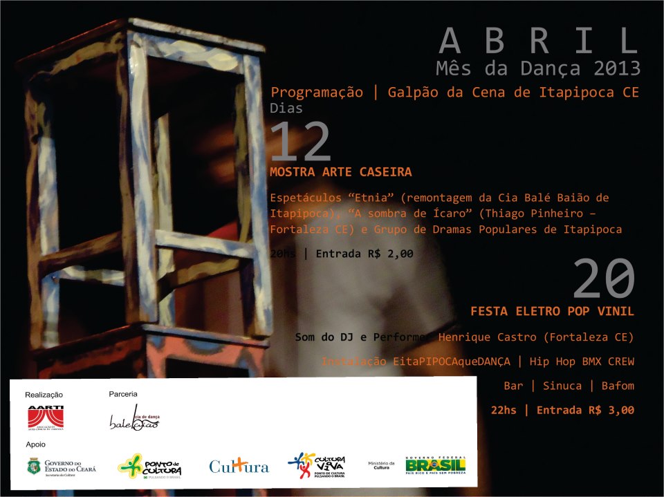 O Ponto de Cultura “Galpão da Cena”, antiga serraria do bairro Coqueiro, é atualmente a sede da Cia Balé Baião de Dança Contemporânea que atua em Itapipoca e Litoral Oeste desde 1997. Desde 2006 desenvolve um trabalho continuado de ensino, pesquisa, produção e circulação de dança, percussão afro e vídeoDança, através da Escola livre de dança Balé Baião, do Núcleo Advento de Audiovisual e do Grupo de Percussão Tambores Afro baião, núcleos de formação permanentes formados por adolescentes, jovens e adultos de cinco bairros periféricos da cidade. No galpão é oferecido semanalmente para 80 adolescentes e jovens entre 14 e 24 anos, aulas de diversas técnicas de dança cênica, desde a contemporânea à afro-brasileira, oficinas de vídeo-arte, palestras, debates sobre temas emergentes e mostra aberta de filmes de arte, espetáculos e performances com a participação de grupos locais e de outras cidades da região. Todas essas ações são ministradas e coordenadas voluntariamente pelos professores e pedagogos da Cia Balé Baião de Dança Contemporânea. Almejamos com o Ponto de Cultura ampliar essas ações, desde o investimento em material didático necessário até a capacitação técnica de nossos educadores. Com isso pretende-se fornecer para nossos jovens, famílias e bairros assistidos: formação sócio-artístico-cultural, resgate e fortalecimento das manifestações populares e étnicas, apreciação artística com o acesso às mostras permanentes, e preparação técnica para o mercado de trabalho através de cursos continuados.