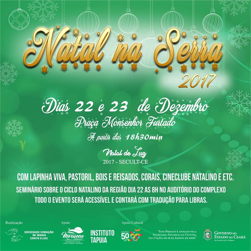 II Natal da Serra (Meruoca)O II Natal na Serra nasce da necessidade de estimular e integrar as várias manifestações natalinas existentes na região Norte do Ceará, hoje batizada de "Sertão de Sobral". O projeto se faz importante para a formação de público e dinamização da economia da Cultura e turismo, criando oportuinidades de fruição dos saberes e fazeres e garantindo a participação de toda a comunidade.